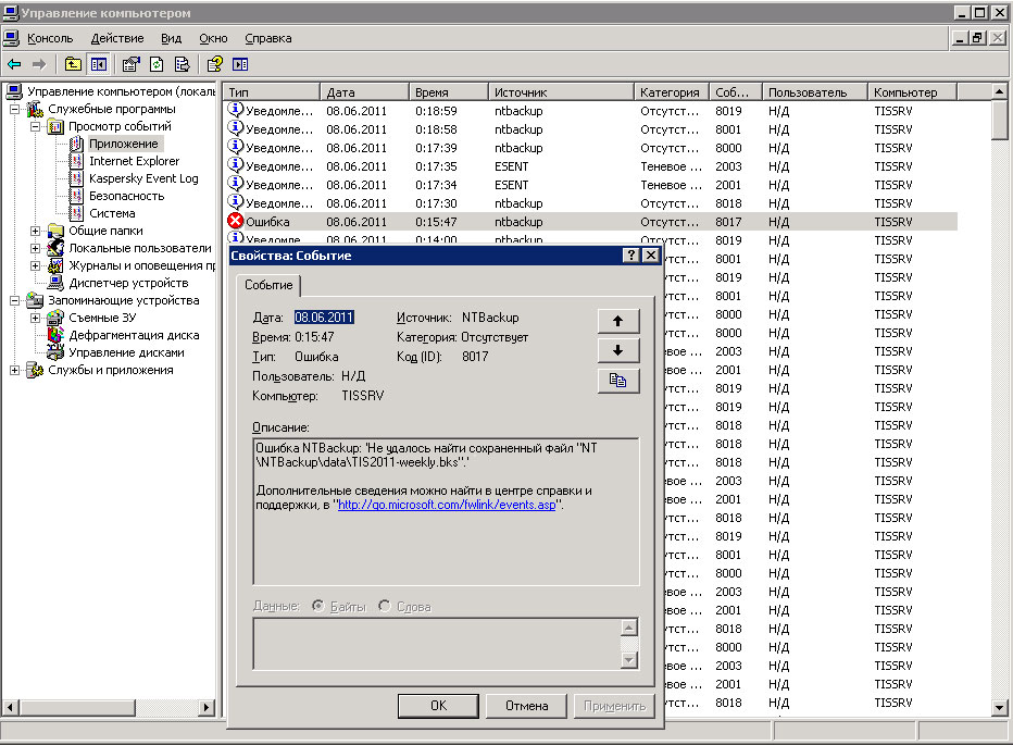 Однако не все так просто, как правило задание это всего лишь список команд, запускающих определенные программы и утилиты с установленным набором настроек. Так, например, при запуске заданий резервного копирования мы получим сообщение что задание завершено с кодом 1f (само задание будет не выполнено). Журнал планировщика никаких подробностей нам не сообщит. Самое время обратиться к системным журналам. В журнале Приложение находим интересующую нас запись: