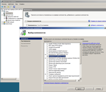 Одним из приятных нововведений Server 2008 является новая оснастка для управления компонентами системы. Если в предыдущих версиях дополнительные компоненты устанавливались, в зависимости от назначения, из разных мест и не всегда было понятно где что искать, то теперь все дополнительные компоненты устанавливаются из оснастки Компоненты в Диспетчере сервера. В нашем случае необходимый функционал содержится в компоненте Возможности рабочего стола.