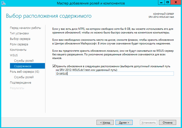 Следующим шагом укажите размещение хранилища обновлений, рекомендуем выделить для этих целей отдельный жесткий диск или раздел диска.