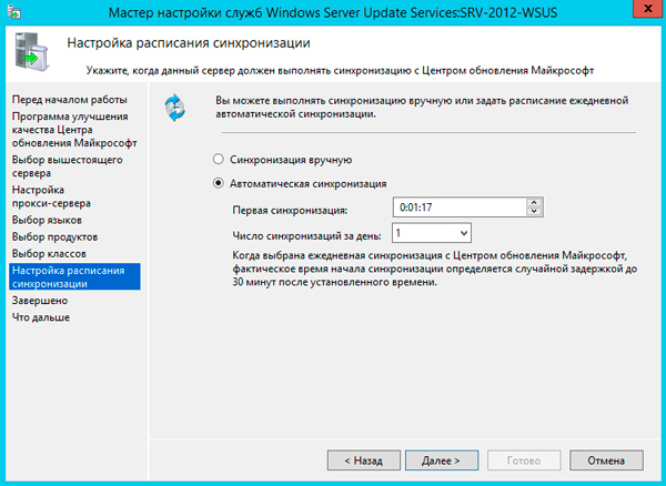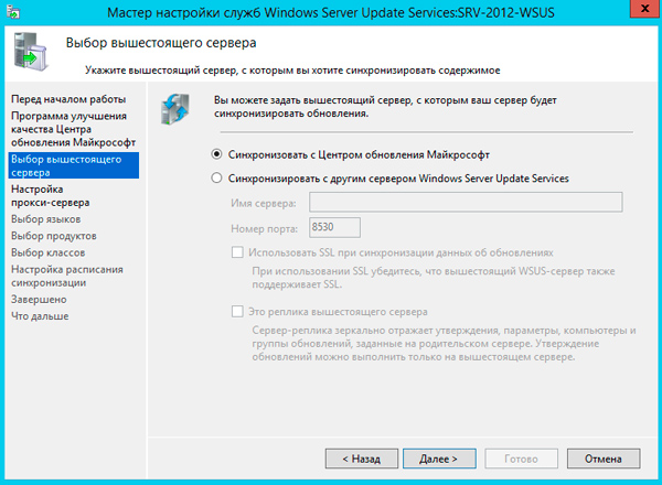 Если коротко, то сначала нужно выбрать источник синхронизации: сервера Microsoft или вышестоящий WSUS сервер.