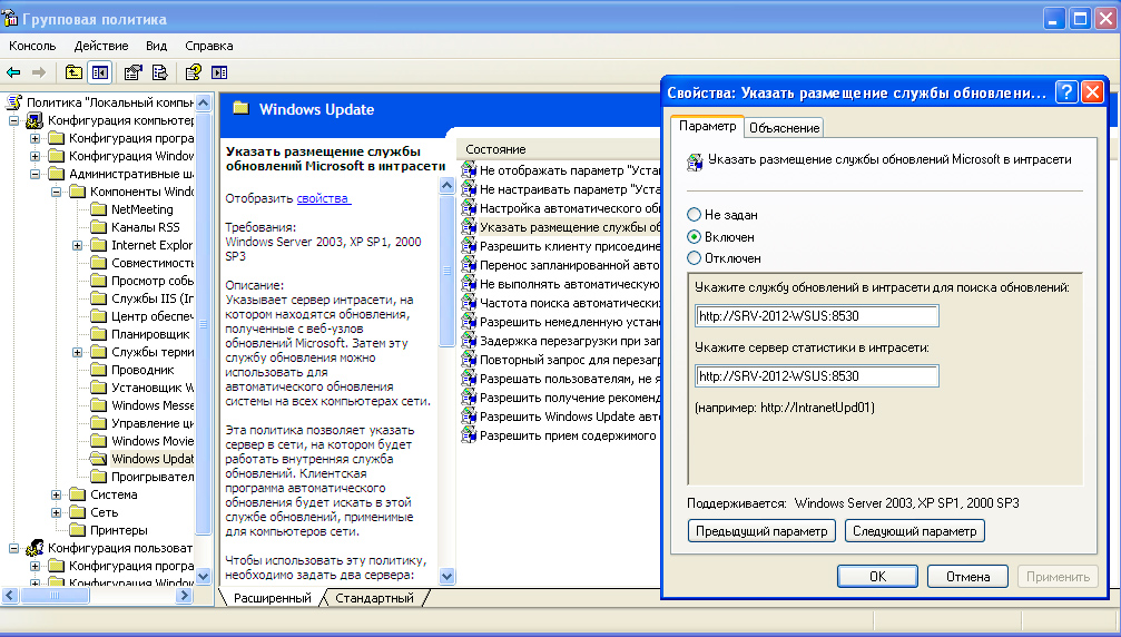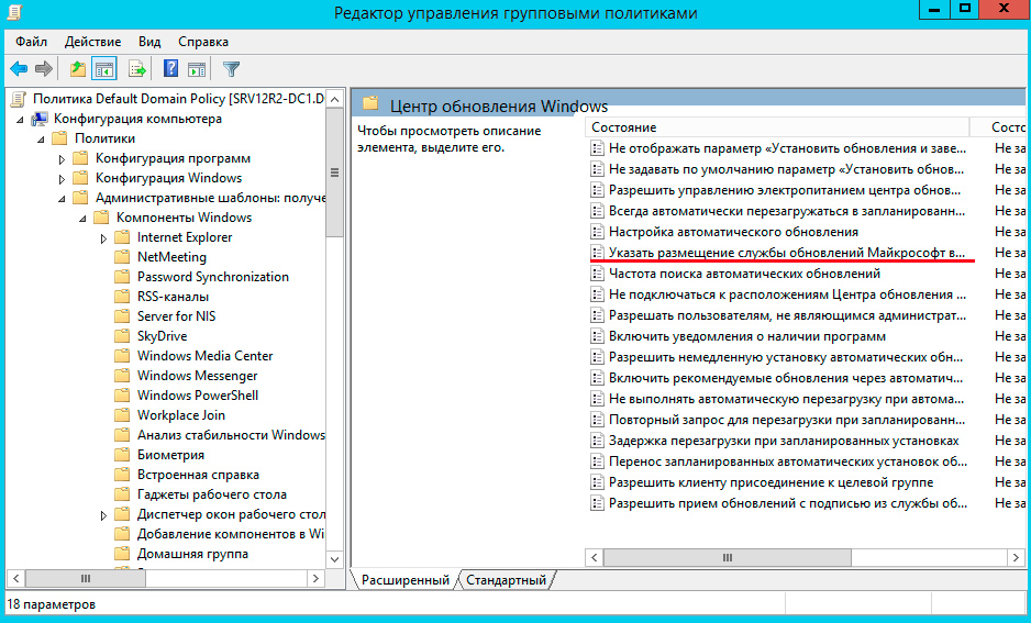 После чего потребуется сообщить клиентам расположение вашего WSUS сервера, это можно сделать через групповые политики: Конфигурация компьютера - Политики - Административные шаблоны - Центр обновления Windows - Указать размещение службы обновлений Microsoft в интрасети.