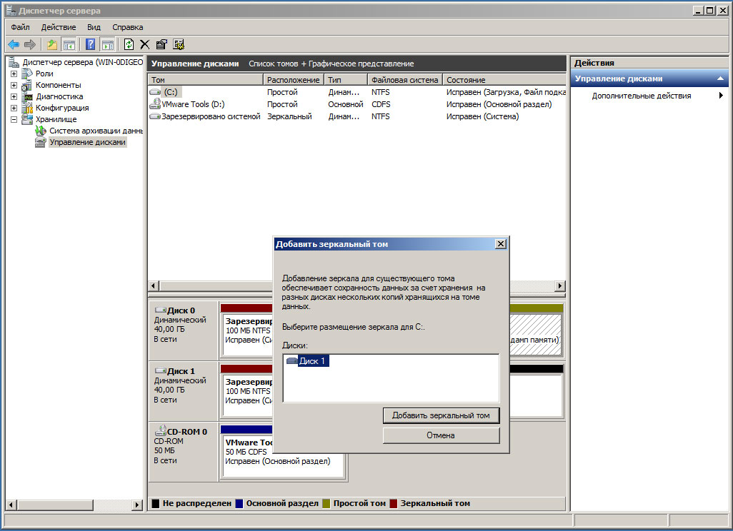 Следующим шагом станет создание массива, щелкаем правой кнопкой мыши на нужном томе и выбираем желаемый вариант, в случае с системным и загрузочными томами вариант будет один - зеркало, потом вам будет предложено выбрать диск для размещения зеркального тома. По завершению создания массива тут же начнется его ресинхронизация.