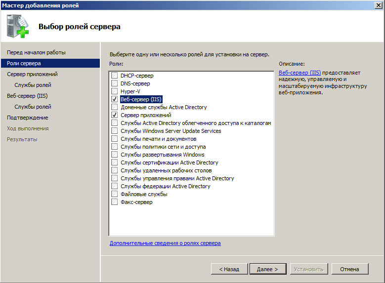 Для установки веб-сервера на платформе Windows перейдем в оснастку Роли в Диспетчере сервера и выберем установку ролей Веб-сервер (IIS) и Сервер приложений.