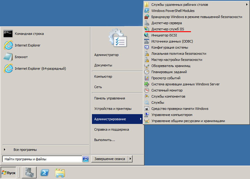 Теперь перейдем в к настройке сервера, для этого откроем Диспетчер служб IIS (находится в Пуск - Администрирование).