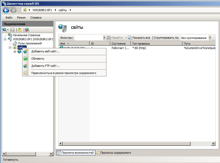 Первым делом создадим новый сайт, для этого щелкните правой кнопке на пункте Сайты в боковом меню Диспетчера IIS и выберите Создать новый сайт.