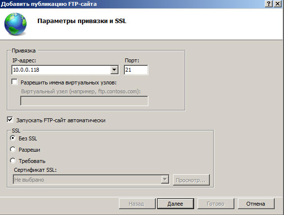 Далее укажите привязку FTP-cлужбы к сетевым интерфейсам и портам, а также настройте параметры безопасности. Если вы собираетесь использовать SSL, то учтите что вам потребуется сертификат, хотя если вы будете использовать FTP-доступ только для собственных нужд, то можно обойтись самоподписанным сертификатом. Не забудьте поставить галочку для автоматического запуска FTP-сайта.