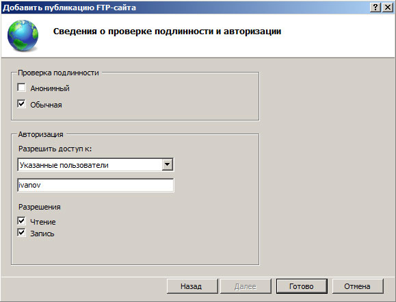 На следующей странице укажите параметры доступа к серверу, мы советуем указывать конкретных пользователей, которые будут работать с данным сайтом.