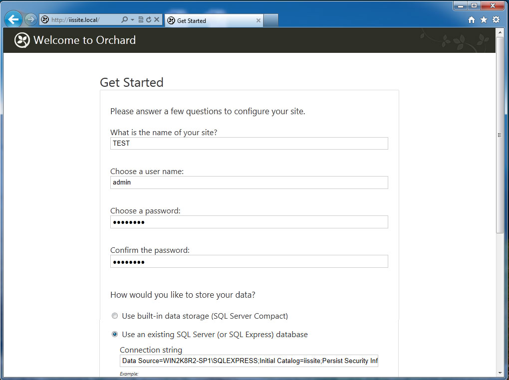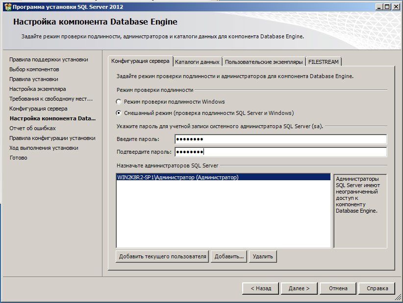 Веб-сервер настроен и вы можете использовать его для размещения HTML-страниц, однако современные сайты используют для хранения своих данных СУБД, поэтому следующим шагом установим MS SQL Express 2012, возможностей которого с лихвой хватит для наших задач. Установка производится со значениями по умолчанию, кроме Режима проверки подлинности, который следует переключить в Смешанный режим и задать пароль суперпользователю SQL-сервера sa.