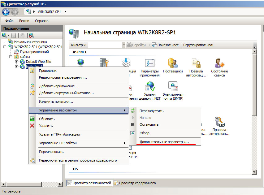 Данная CMS создана на базе ASP.NET 4, поэтому настроим наш сайт на использование необходимых технологий. Для этого щелкните правой кнопкой на имени сайта в боковом меню и выберите Управление веб-сайтом - Дополнительные параметры