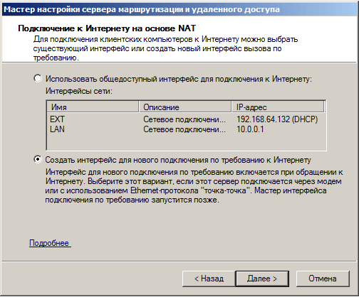 Мы не будем заново описывать весь процесс настройки сервера, для этого следует обратиться к предыдущей статье, а остановимся только на различиях. Будем считать, что роль Службы маршрутизации и удаленного доступа уже установлена и вы приступили к настройке маршрутизации и удаленного доступа. В качестве конфигурации выбираем Преобразование сетевых адресов (NAT) и переходим к следующему экрану. Здесь выбираем Создать интерфейс для нового подключения по требованию к Интернету. Существующее подключение (если есть) следует удалить или отключить.
