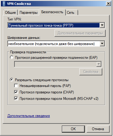 На закладке Безопасность указываем параметры шифрования выданные вашим провайдером, либо уточните их при отсутствии данных. Приведенные на рисунке настройки отражают лишь наш частный случай.