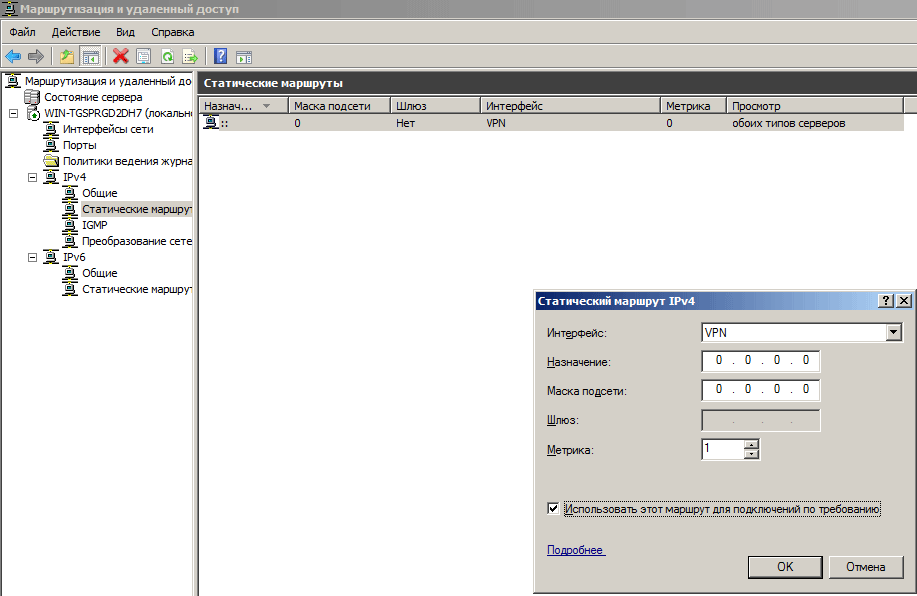 Настроив соединение переходим в раздел IPv4 - Статические маршруты, выбираем маршрут относящийся к нашему интерфейсу по требованию (в данном примере это единственный маршрут) и обязательно устанавливаем галочку Использовать этот маршрут для подключений по требованию.