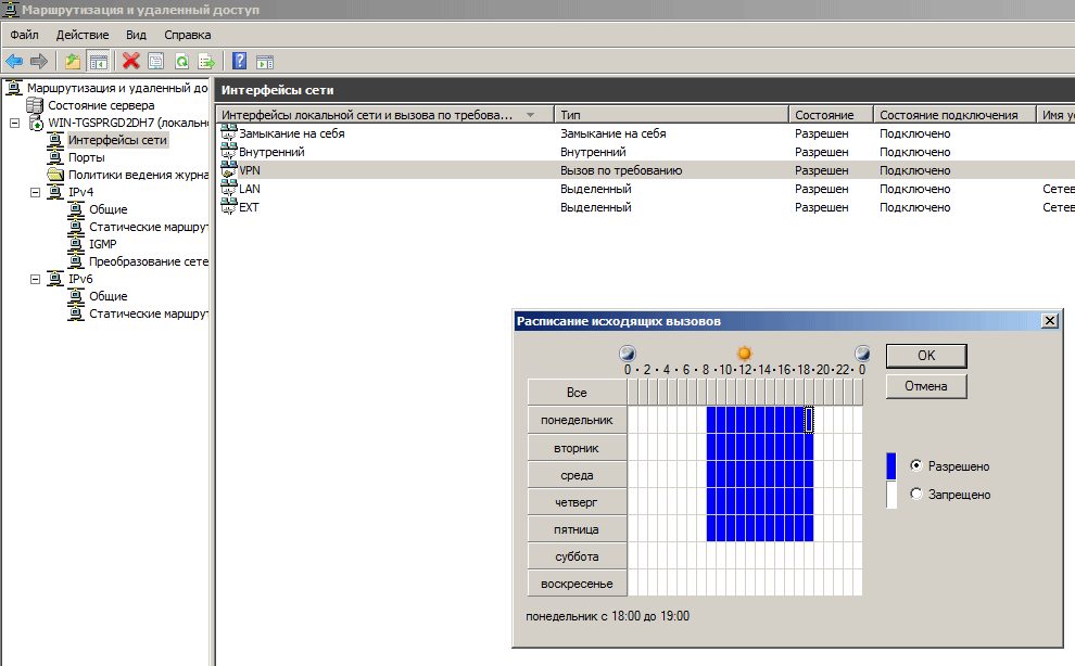 Из дополнительных настроек стоит отметить возможность устанавливать расписание для исходящих вызовов (доступно в меню по правой кнопке мыши на соединении), что позволяет указать время, в которое доступ к интернет посредством коммутируемого интерфейса будет доступен. В нашем примере мы настроили доступ с 8 до 19 часов в рабочие дни.
