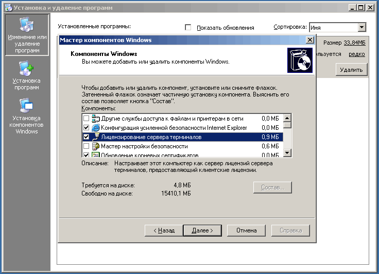 На этом этапе нам потребуется установочный диск Windows Server, который следует заранее иметь под рукой, по завершении установки сервер будет перезагружен. После перезагрузки видим, что роль сервера терминалов успешно добавлена, однако присутствует надпись, что поскольку не найден сервер лицензирования служб терминалов выдача лицензий прекратится через 120 дней. Необходимо установить сервер лицензирования. Для этого в оснастке Установка и удаление программ выбираем Установка компонентов Windows и в открывшемся окне ставим галочку на Лицензирование сервера терминалов.