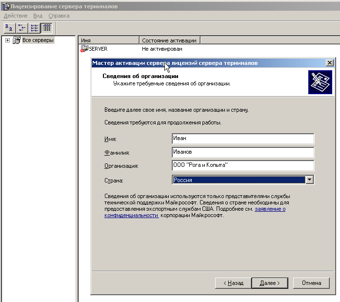 Теперь выбираем Пуск - Администрирование - Лицензирование сервера терминалов. В открывшемся окне выбираем Действие - Активировать сервер. В качестве способа активации указываем Автоподключение (нужен интернет) и заполняем небольшую анкетку. Указываем сведения об организации и электронную почту никаких номеров здесь не требуется, сама активация носит номинальный характер и не совсем понятно какой смысл в нее вкладывает Microsoft.