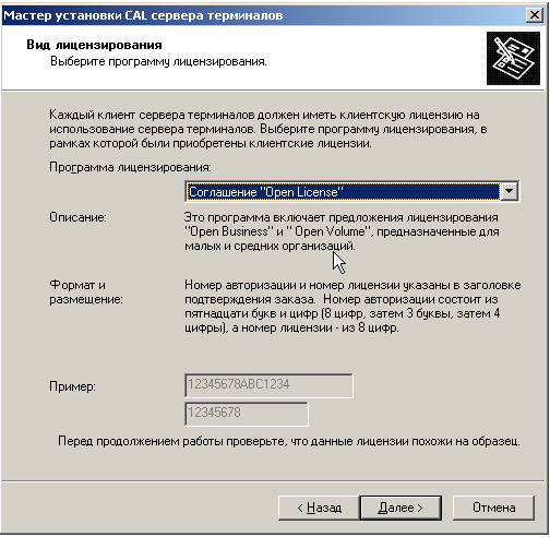 По завершению активации будет запущен мастер клиентских лицензий. В окне Вид лицензирования выбираем программу лицензирования соответствующую имеющимся терминальным лицензиям. Для небольших фирм это как правило "Open License", перед тем как продолжить убедитесь что все необходимые данные есть под рукой.