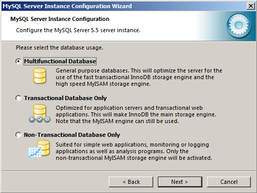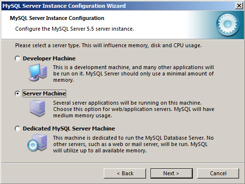 Следующий экран предложит нам выбор между рабочей станцией разработчика, сервером и выделенным MySQL сервером. Последний режим позволит СУБД утилизировать все доступные ресурсы, что в нашем случае неприемлемо, поэтому выбираем режим сервера.