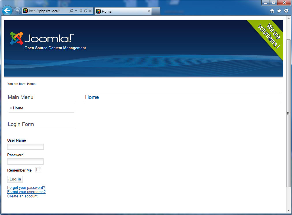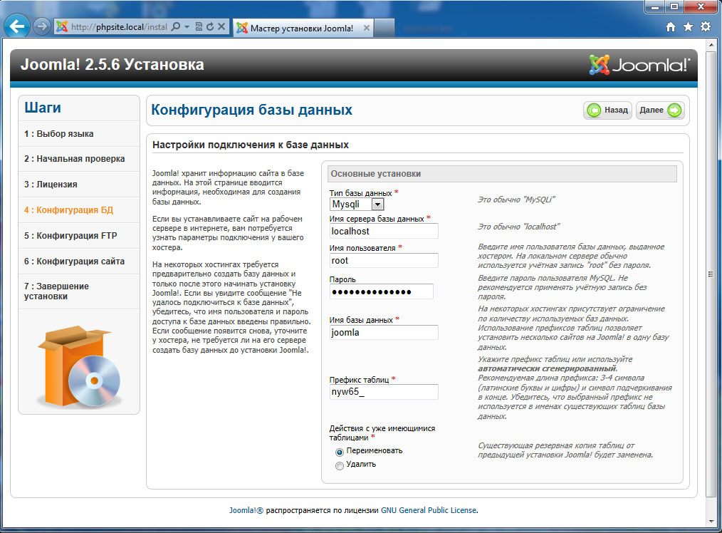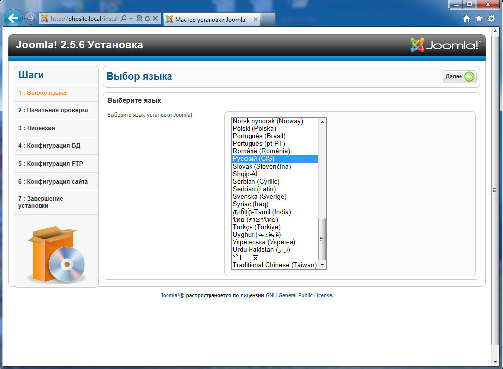 Теперь попробуем установить на сайт phpsite.local, который мы создали в предыдущей статье, популярную CMS Joomla.