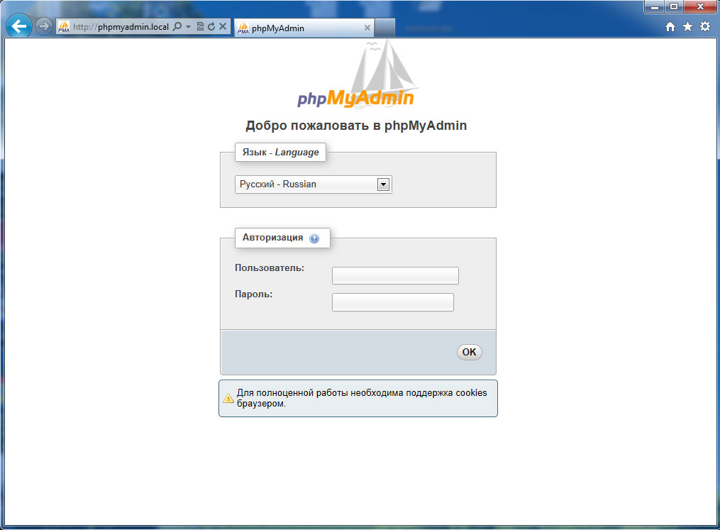 Скачиваем последнюю версию утилиты с официального сайта и размещаем ее в папке созданного сайта phpmyadmin.local, не забываем выставить полные права для групп IIS_IUSRS и IUSR. Для авторизации используем учетные данные нашего MySQL сервера.