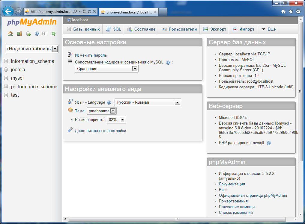 Для управления MySQL базами данных мы рекомендуем использовать phpMyAdmin, его можно установить как в папку текущего сайта, так и создать для него отдельный сайт, мы рекомендуем последний вариант.