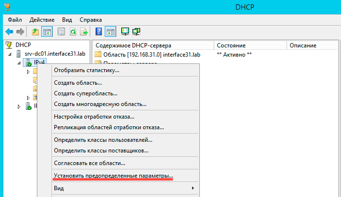 Начнем с настройки DHCP, откроем соответствующую оснастку и перейдем к списку серверов, щелкните правой кнопкой мыши на пункт IPv4 и выберите Предопределенные параметры.