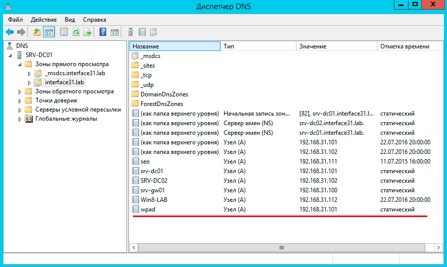 Откроем опцию GlobalQueryBlockList и удалим оттуда значение wpad, после чего службу DNS нужно перезапустить.