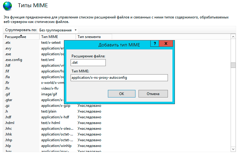 Для правильной работы с PAC-файлом добавьте новый тип MIME, указав расширение .dat и тип MIME application/x-ns-proxy-autoconfig.