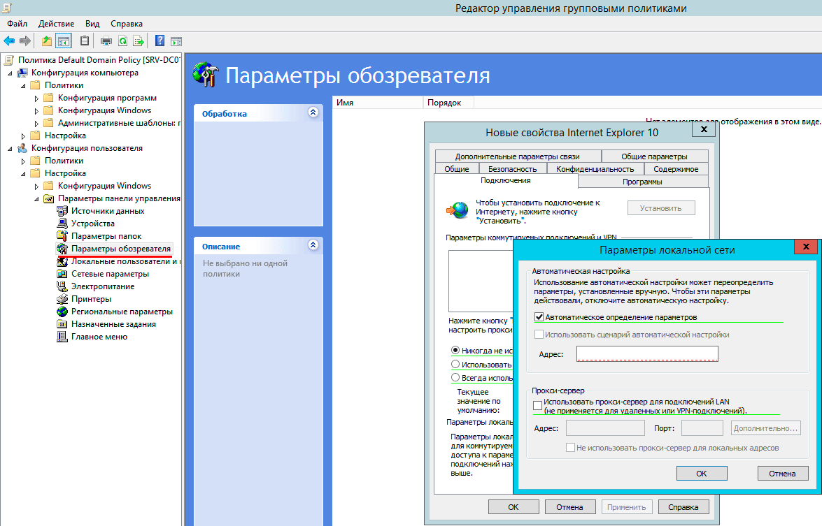 Как правило, дальнейших действий не требуется. Internet Explorer и Edge по умолчанию имеют настройку автоматического определения настройки параметров прокси-сервера. Но можно подстраховаться и создать отдельную политику в GPO, для этого используйте Конфигурация пользователя - Настройка - Параметры панели управления - Параметры обозревателя.