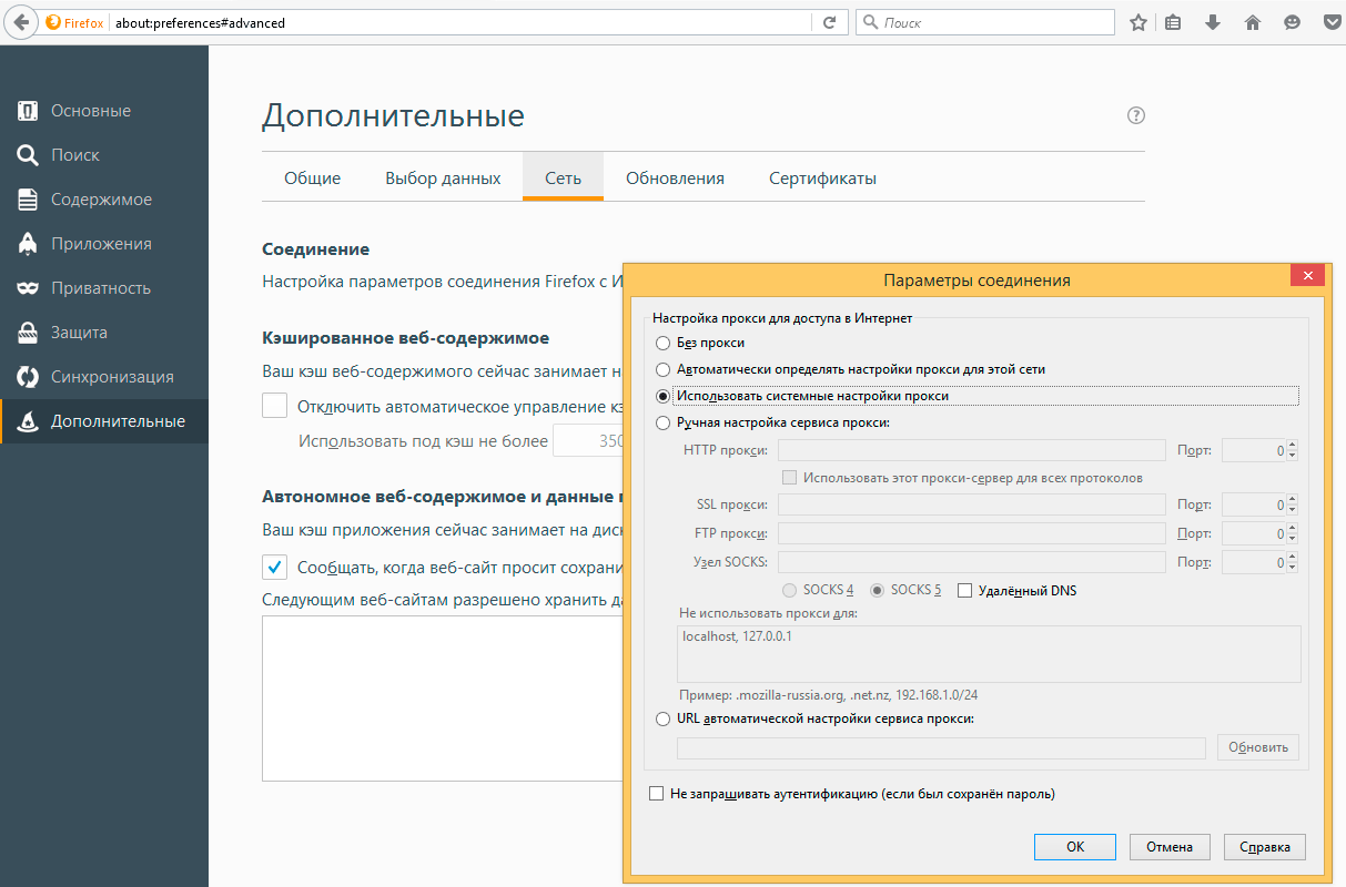 Браузеры на основе Google Chrome (в т.ч. Opera, Яндекс) используют настройки, заданные для IE. Проблемы, как всегда, возникают с Firefox, который с настройкой по умолчанию Использовать системные настройки прокси игнорирует их и ходит напрямую, поэтому данную опцию следует изменить на Автоматически определять настройки прокси для этой сети.