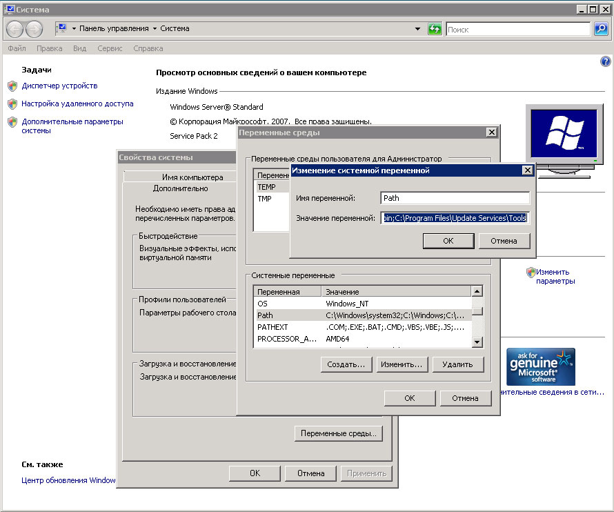 Итак, новый диск куплен и подключен к серверу. Как правильно перенести на него базу обновлений? Для этой цели будем использовать штатную утилиту wsusutil. Однако перед ее использованием мы советуем произвести ряд подготовительных действий, позволяющих существенно повысить удобство ее использования. В частности стоит добавить путь к данной утилите в переменную PATH, что позволит обращаться к ней непосредственно по имени, без указания полного пути. Для этого выберем Панель управления - Система - Дополнительные параметры системы - Дополнительно - Переменные среды. Находим переменную PATH и в самый конец, через точку с запятой, без пробелов добавляем путь к утилите wsusutil: C:\Program Files\Update Services\Tools