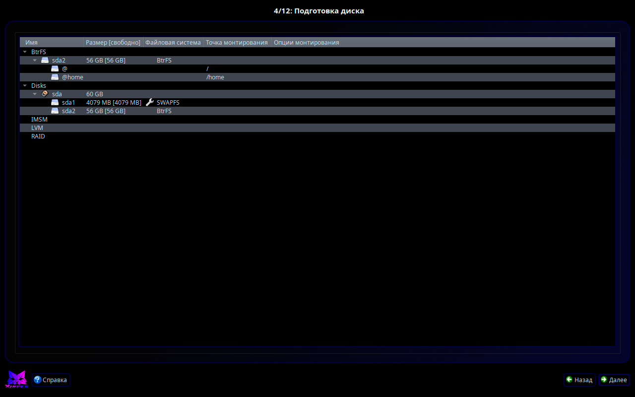 В остальном это стандартный инсталлятор и если вы хоть раз устанавливали системы Альт, то все будет привычно. Для разметки диска предлагается файловая система BTRFS, разметка стандартная: сначала файл подкачки, затем основной раздел. Это удобно при расширении диска.