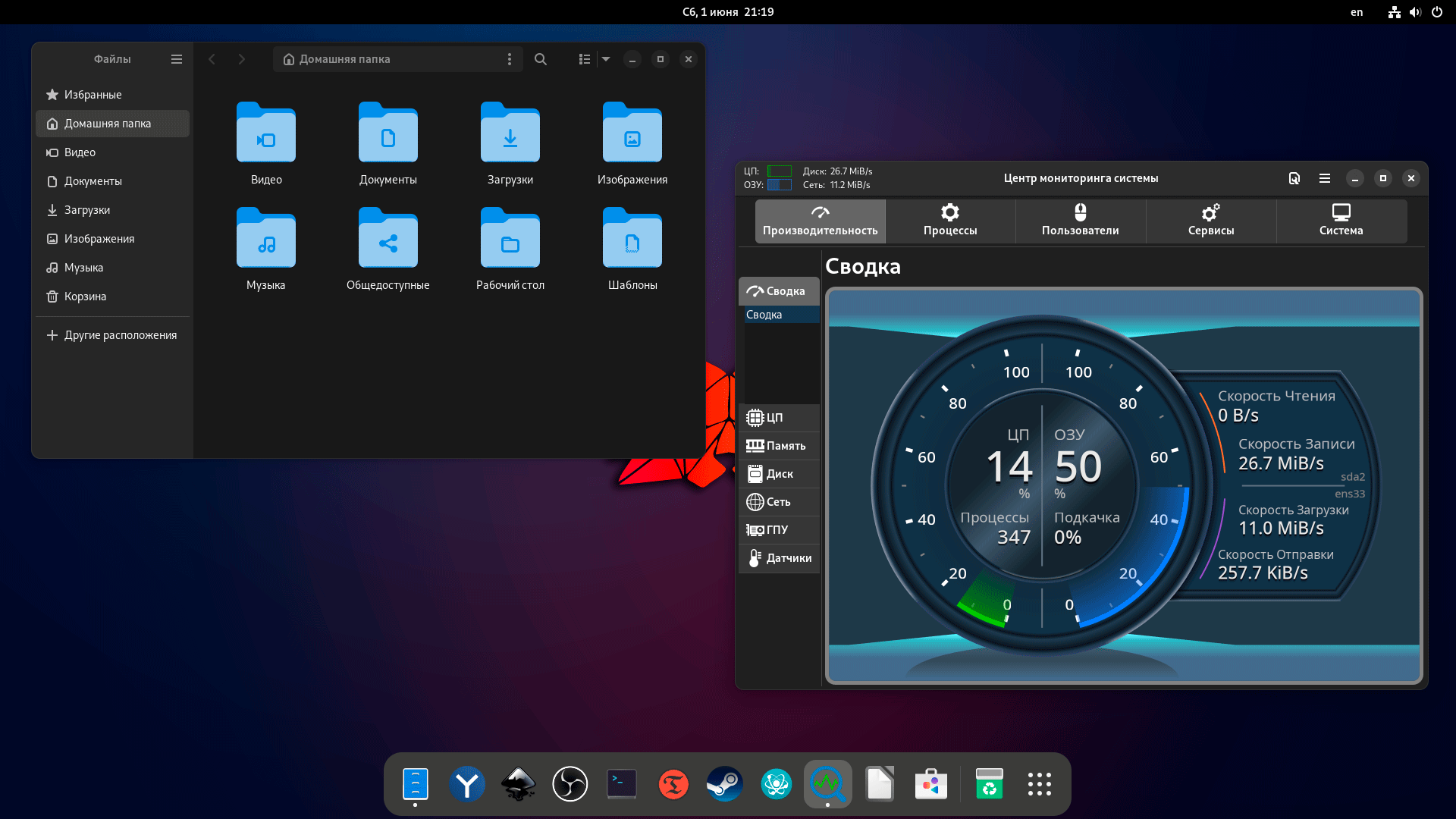 По умолчанию выбрана темная тема, которая отлично проработана как для GTK, так и для Qt приложений, что позволяет системе выглядеть стильно и однообразно. Системные требования также довольно высоки, что в общем характерно для GNOME, выделенных нами 4 ГБ оперативной памяти хватает только для тестирования в повседневной работе такого объема будет постоянно не хватать.