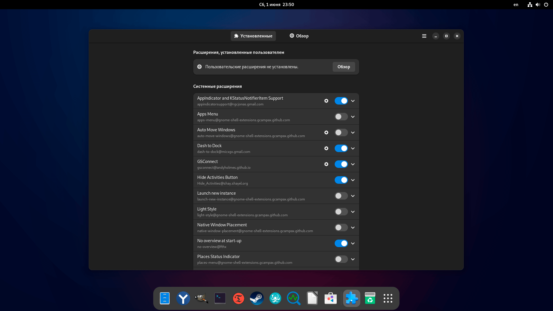 Для гибкой настройки рабочей среды в системе сразу установлен менеджер расширений GNOME откуда вы можете настраивать уже установленные расширения, а также добавлять новые.