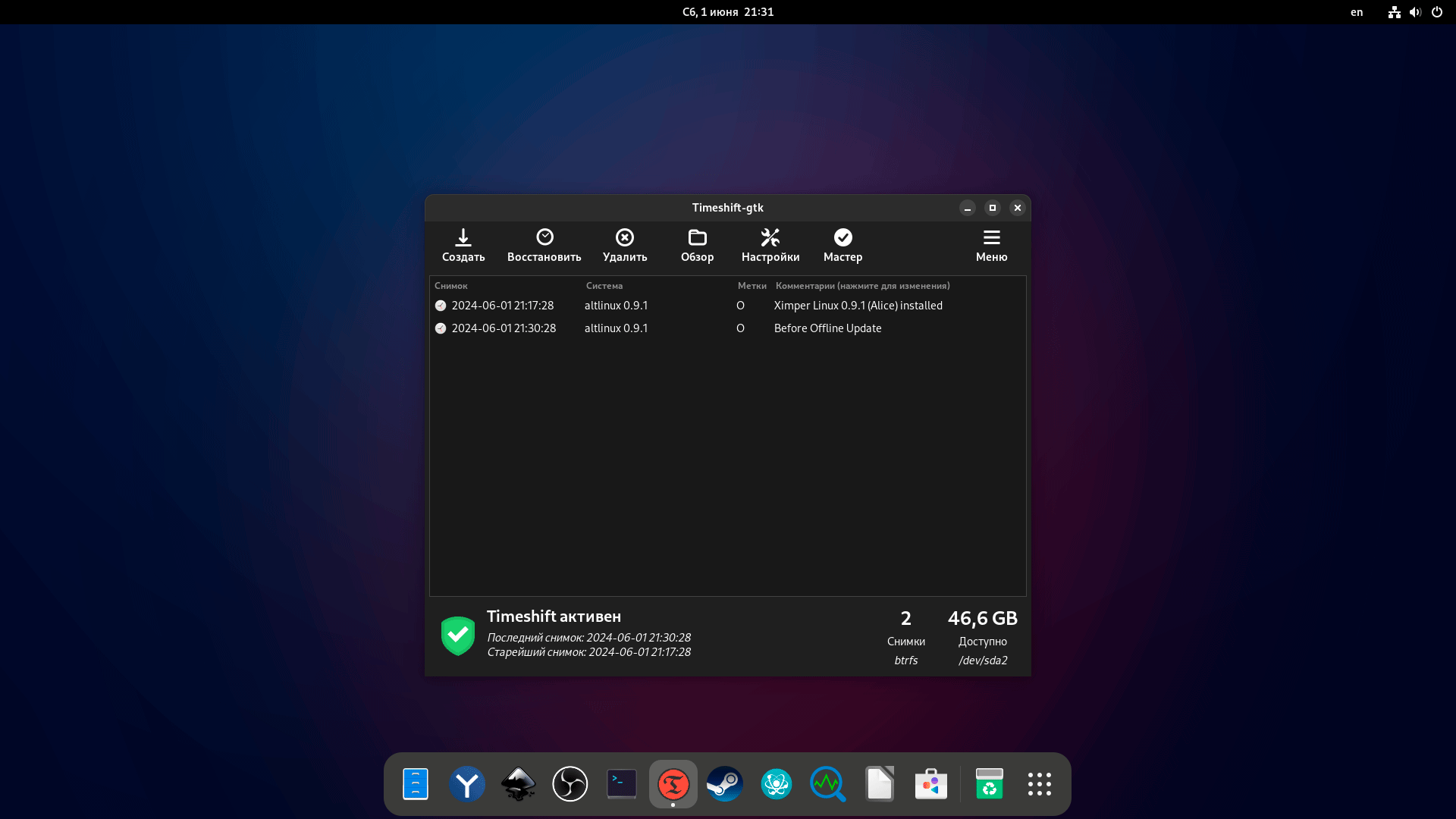 Для резервного копирования системы предназначен Timeshift, который в сочетании со снимками BTRFS позволяет выполнять откат на нужную точку прямо из загрузочного меню, что удобно и позволяет восстановить систему даже в случае полного отказа.