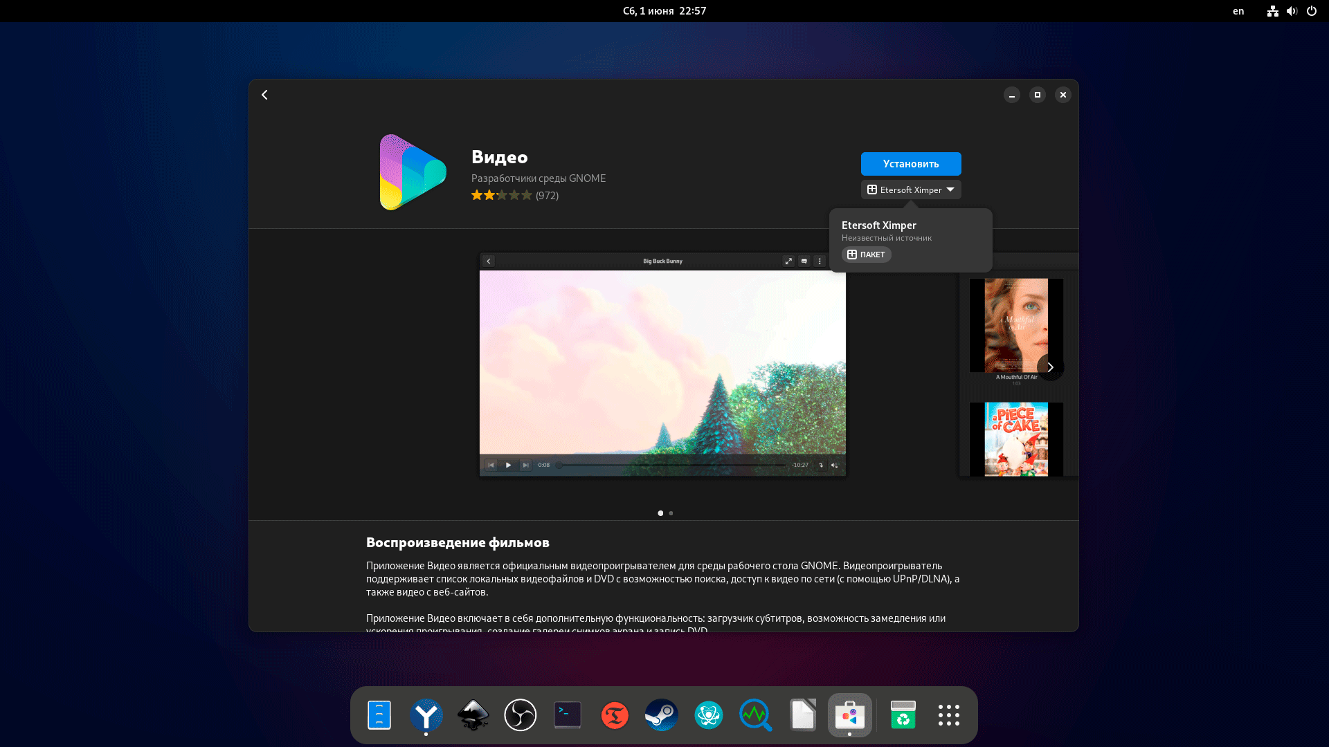 Единственный неудачный выбор - это видеоплеер mpv, который порадовал нас красивым зеленым экраном. Возможно такое поведение связано с запуском его в виртуальной машине, но другое аналогичное ПО давно спокойно работает в системах виртуализации. Тем более непонятен такой выбор с учетом наличия штатного для GNOME приложения Видео, которое мы установили и без проблем воспроизвели ролики разных форматов и разрешений вплоть до 4К.