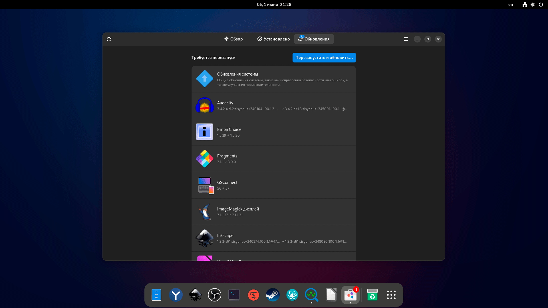 Для управления программным обеспечением предназначен магазин GNOME, который также является стандартным пакетом оболочки. Здесь вы можете искать и устанавливать новый софт, управлять уже установленным и обновлять систему. Обновления предусматривают установку при перезагрузке, что для пользовательской системы только плюс.