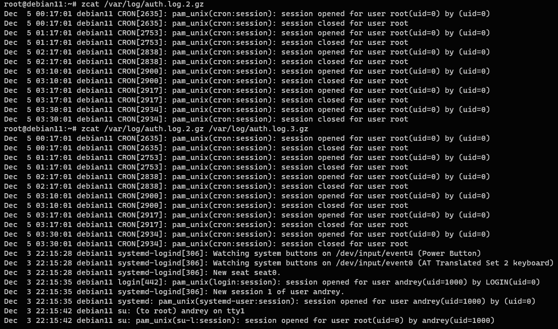 1 zgrep andrey /var/log/auth.log.3.gz /var/log/auth.log.2.gz