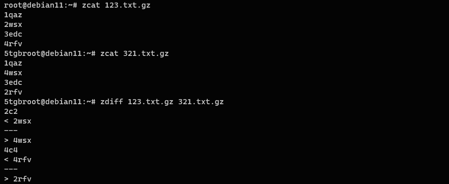 Чтобы сравнить два сжатых файла следует использовать Z-команду zdiff, она работает точно также, как и ее обычный аналог: