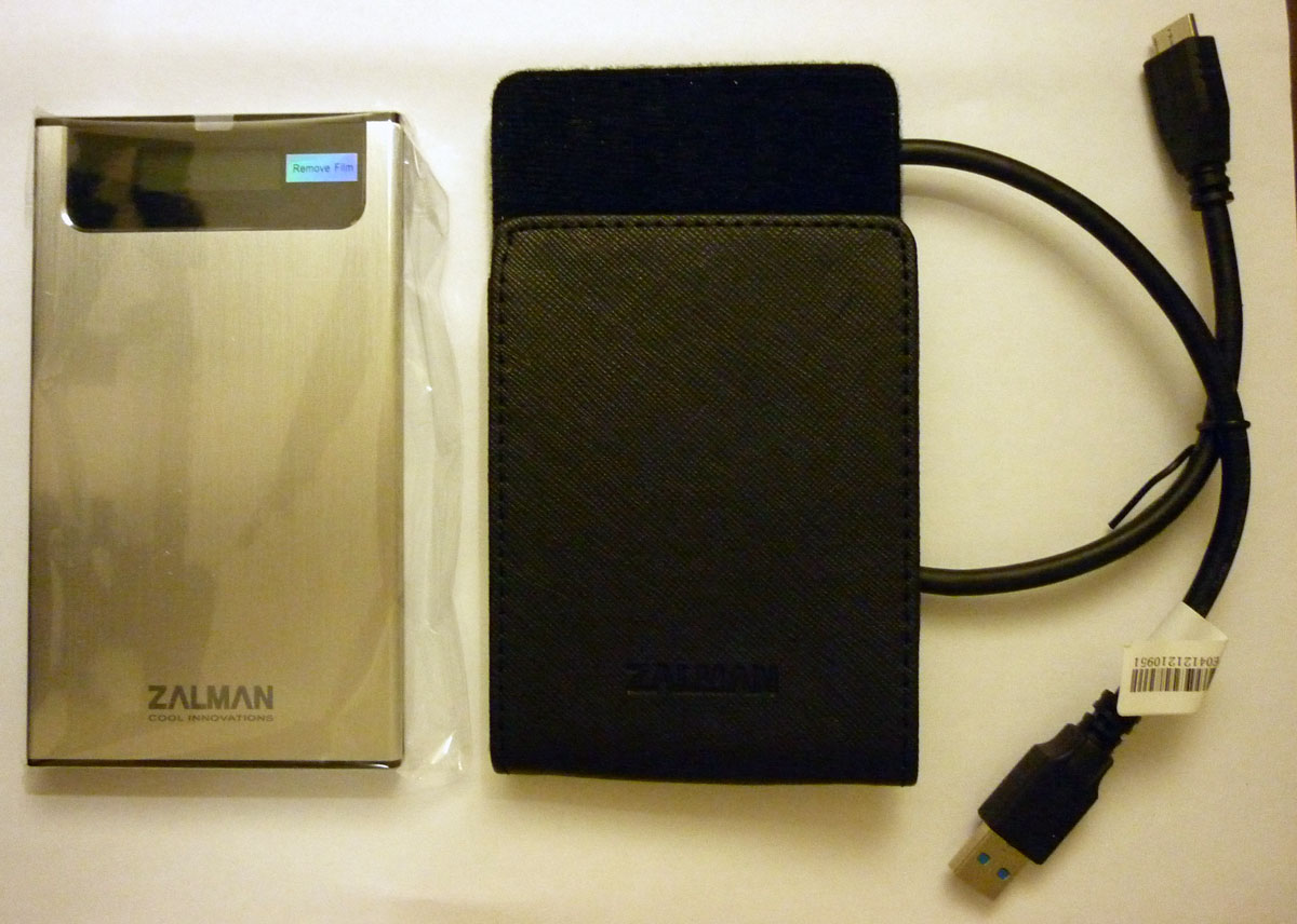 Комплектация, традиционно для Zalman, богатая. Кроме устройства, кожаного футляра к нему и microUSB 3.0 кабеля в коробке вы найдете инструкцию, компакт-диск с софтом и небольшую отвертку с винтиками. Единственный, на наш взгляд, недостаток - футляр не имеет отдела для хранения кабеля, что требует постоянно контролировать его наличие, а это вносит определенный элемент неудобства при использовании.
