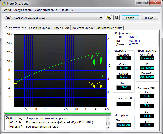 Общий расклад никакой неожиданности не представляет. ASUS DRW-2014L1T достиг при работе с DVD-дисками 12х скорости и 40х при работе с CD. В общем довольно неплохо.