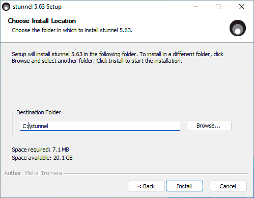 В первую очередь скачаем stunnel c официального сайта. Установка стандартная, единственный момент - измените расположение по умолчанию так, чтобы в пути не было пробелов, например C:\stunnel: