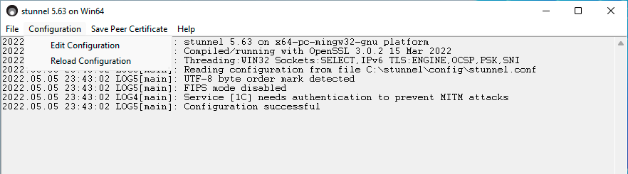 При установке будет создан конфигурационный файл C:\stunnel\config\stunnel.conf, он содержит большое количество комментариев и примеры подключения к стандартным сервисам, вроде почтовых служб, поэтому смело удаляем его содержимое и вносим следующий текст: