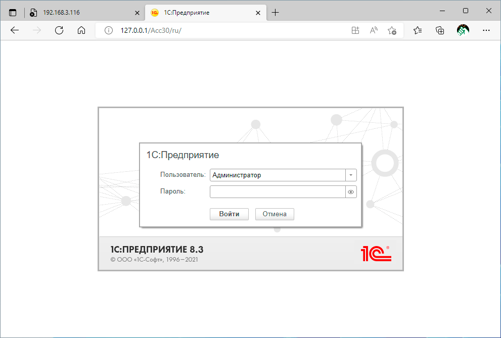 Сохраняем конфигурацию и копируем в C:\stunnel\config файл сертификата клиента client1.pem. Перезапускаем сервис и пытаемся соединиться веб-клиентом 1С с localhost, если все сделано правильно, то подключение будет успешным.