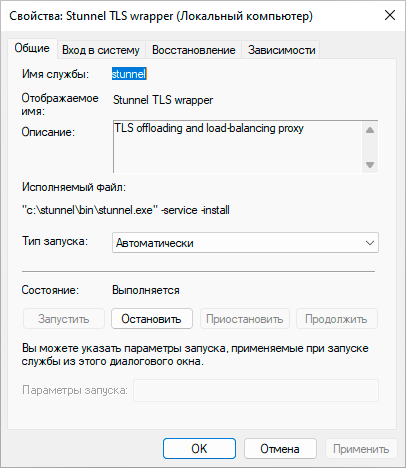 Перезагрузим компьютер и убедимся, что все работает и служба stunnel запускается без ошибок.