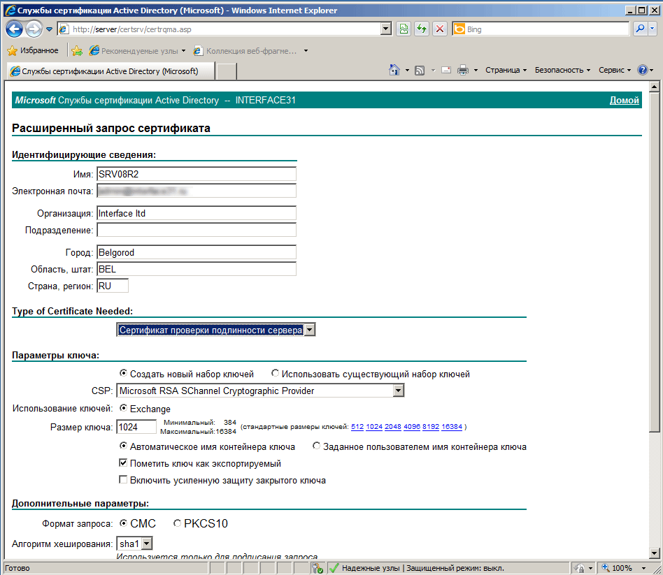 Затем следует выполнить запрос сертификата подлинности сервера со следующими параметрами:
