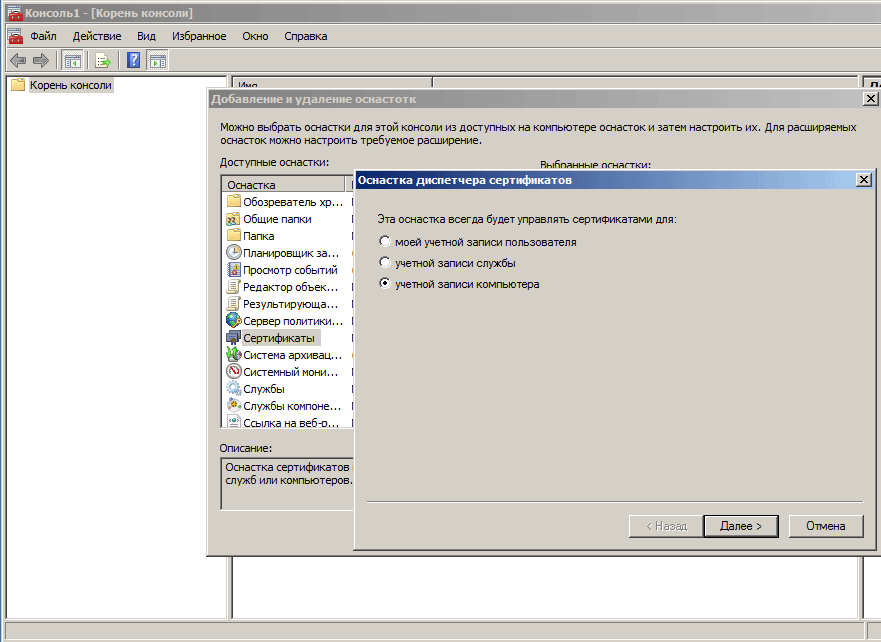 Отправьте запрос центру сертификации и установите выданный сертификат. Данный сертификат должен быть установлен в локальное хранилище компьютера, иначе он не сможет быть использован службами терминалов. Чтобы проверить это запустим консоль MMC (Пуск - Выполнить - mmc) и добавим оснастку Сертификаты(Файл - Добавить или удалить оснастку) для учетной записи компьютера.