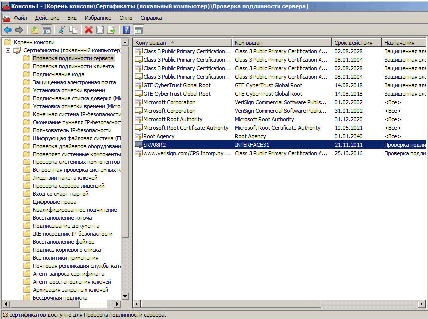 После чего удалите сертификат из данного хранилища. В оснастке Сертификаты (локальный компьютер) выберите раздел Проверка подлинности сервера, щелкните на него правой кнопкой мыши Все задачи - Импорт и импортируйте сертификат.