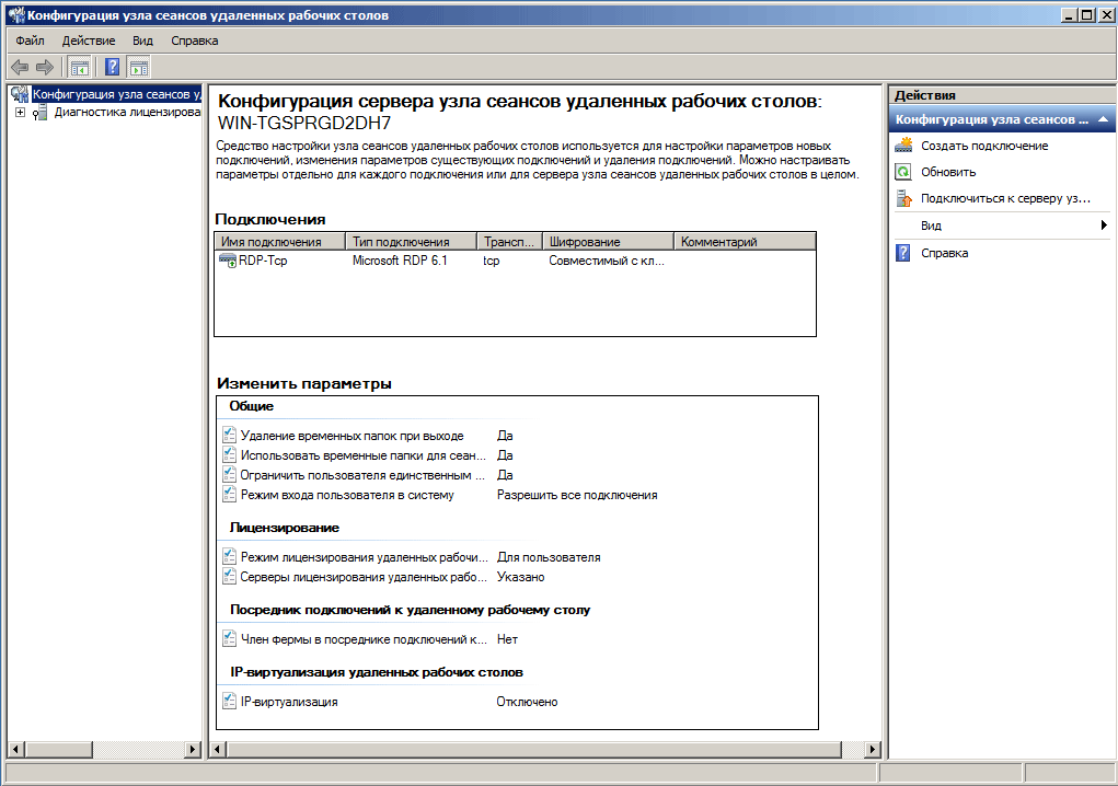 Теперь в Администрирование - Службы удаленных рабочих столов откройте Конфигурация узла сеансов удаленных рабочих столов ( в Windows Server 2003 Администрирование - Настройка служб терминалов).