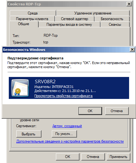 Какие преимущества дает нам защита RDP при помощи SSL? Во первых надежное шифрование канала, проверку подлинности сервера на основании сертификата и проверку подлинности пользователя на уровне сети. Последняя возможность доступна начиная с Windows Server 2008. Проверка подлинности на уровне сети позволяет повысить безопасность сервера терминалов за счет того, что проверка происходит еще до начала сеанса.
