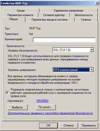 При использовании Windows Server 2003 SP1 и более поздних версий, будут доступны шифрование канала при помощи SSL (TLS 1.0) и проверка подлинности сервера, клиентские ПК должны иметь версию RDP клиента 5.2 или более позднюю.